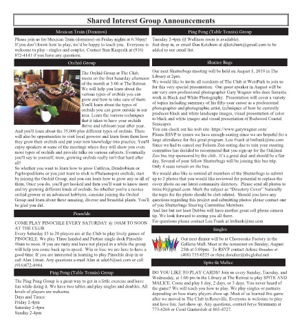 The Orchid Group at The Club, Our next Shutterbugs meeting will be held on August 1, 2019 in The