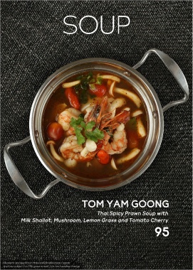 SOUP TOM YAM GOONG Thai Spicy Prawn Soup with Milk Shallot, Mushroom, Lemon Grass and Tomato Cherry 95 All prices are quotes in thousand Indonesian rupiah and are subject to 21% government tax and service charge