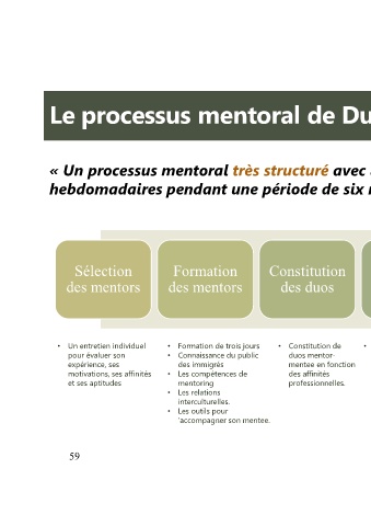 • Un entretien individuel • Formation de trois jours • Constitution de • Le duo constitué se • Pendant six mois, le mentor • la structure de
