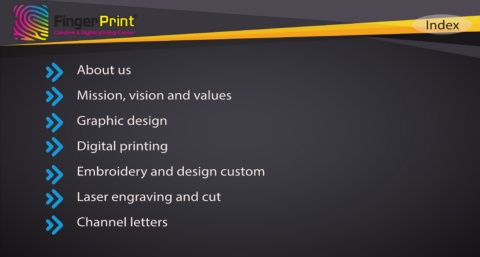 Index Creative & Digital printing Center About us Mission, vision and values Graphic design Digital printing Embroidery and design custom Laser engraving and cut Channel letters