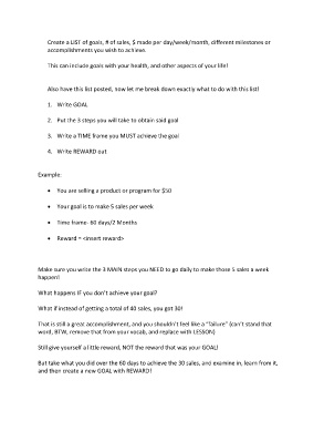Create a LIST of goals, # of sales, $ made per day/week/month, different milestones or