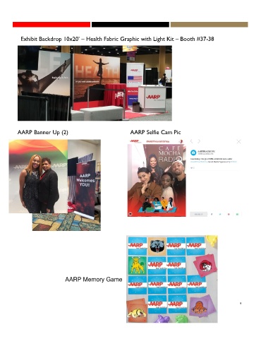 Exhibit Backdrop 10x20’ – Health Fabric Graphic with Light Kit – Booth #37-38 AARP Banner Up (2) AARP Selfie Cam Pic AARP Memory Game 9