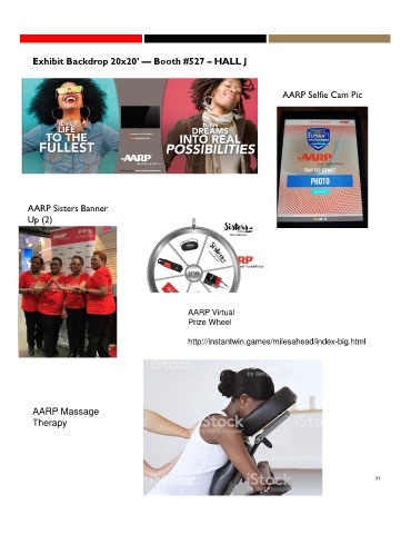 Exhibit Backdrop 20x20’ –– Booth #527 – HALL J AARP Selfie Cam Pic AARP Sisters Banner Up (2) AARP Virtual Prize Wheel http://instantwin.games/milesahead/index-big.html AARP Massage Therapy 31