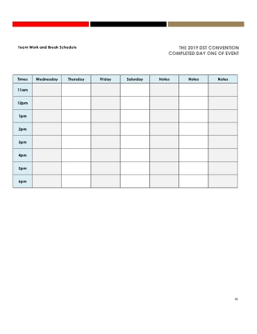 Team Work and Break Schedule THE 2019 DST CONVENTION COMPLETED DAY ONE OF EVENT Times Wednesday Thursday Friday Saturday Notes Notes Notes 11am 12pm 1pm 2pm 3pm 4pm 5pm 6pm 36