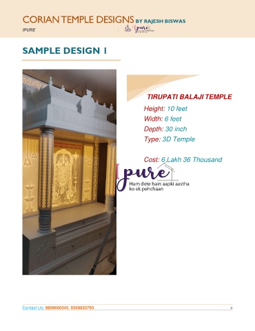 CORIAN TEMPLE DESIGNS BY RAJESH BISWAS IPURE SAMPLE DESIGN 1 TIRUPATI BALAJI TEMPLE Height: 10 feet Width: 6 feet Depth: 30 inch Type: 3D Temple Cost: 6 Lakh 36 Thousand Contact Us: 9899660340, 8368833703 4