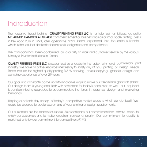 The creative head behind QUALITY PRINTING PRESS LLC is a talented ambitious. go-getter Mr. AHMED HAMMED AL GHAFRI commencement of business was as a small scale Printing press in Rex Road Ruwi in 1991, later operations have been expanded into the entire sultanate, which is the result of dedicated team work, deligence and competence.