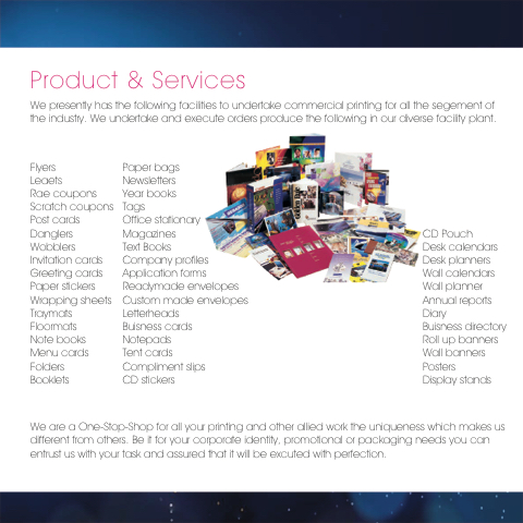 We presently has the following facilities to undertake commercial printing for all the segement of the industry. We undertake and execute orders produce the following in our diverse facility plant.