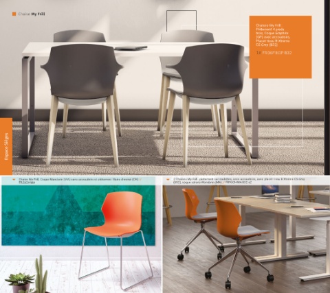 Chaise My Frill, Coque Mandarin (MA) sans accoudoirs et piètement filaire chromé (CH) // 2 Chaises My Frill : piètement sur roulettes, sans accoudoirs, avec placet tissu B Xtreme CS Grey