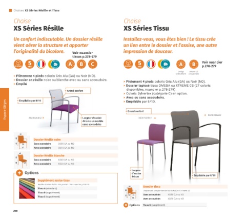 > Empilable par 8/10. > Dossier tapissé tissu OMEGA ou XTREME CS (27 coloris