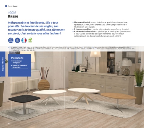 H.44,5 x L.107 x P.60 cm // TBK10 BL BL // Table basse Galet Blanc (BL), pied pyramidal bois (FB) // H.44,5 x L.107 x P.60 cm // TBJ10 FB BL // Table basse Galet Chêne clair (CL), 4 pieds plats Chromés (CH)