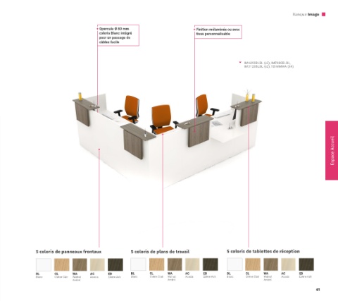 5 coloris de panneaux frontaux 5 coloris de plans de travail 5 coloris de tablettes de réception