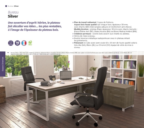 Bureau Silver : Plan droit avec crédence porteuse, piètement Blanc et plateau bicolore Blanc/Walnut Ambré (WB) avec option voile de fond bois pour plan droit avec crédence porteuse, coloris Blanc (BL) et