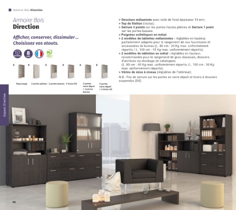 N.B.: Pas de serrure sur les portes en verre dépoli et tiroirs à dossiers