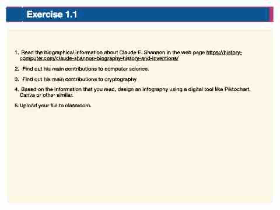 1. Read the biographical information about Claude E. Shannon in the web page https://history- computer.com/claude-shannon-biography-history-and-inventions/
