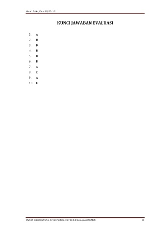 Modul Fisika, Kelas XII, KD. 3.5 KUNCI JAWABAN EVALUASI 1. A 2. B 3. D 4. B 5. D 6. B 7. A 8. C 9. A 10. E @2020, Direktorat SMA, Direktorat Jenderal PAUD, DIKDAS dan DIKMEN 31