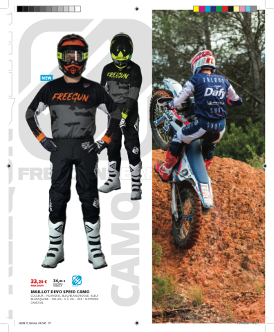 NEW 33,20 € PRIX DAFY CONSEILLÉ MAILLOT DEVO SPEED CAMO COULEUR : NOIR/GRIS, BLEU/BLANC/ROUGE, BLEU/ BLANC/JAUNE - TAILLES : S À 2XL - RÉF : SHOTFREE CAMO ML 34,95 € PRIX PUBLIC 37 catdaf_tt_tenues_v3.indd 37 15/09/2020 11:23 TENUES CAMO