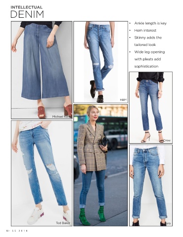 INTELLECTUAL DENIM • Ankle length is key • Hem interest • Skinny adds the tailored look • Wide leg opening with pleats add sophistication H&M Michael Kors J Crew Ted Baker Zara . 18 S S 2018