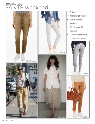 INTELLECTUAL PANTS weekend • Chino's • Ankle length is key • Slim & relaxed joggers • Slim & loose fit trousers • Elastic waist details update the trouser J Crew Club Monaco H&M Donegar H&M . 22 S S 2018