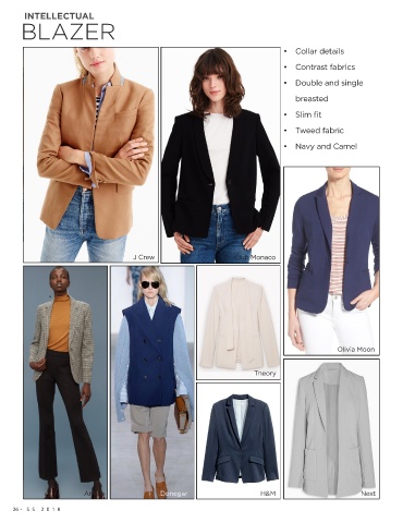 INTELLECTUAL BLAZER • Collar details • Contrast fabrics • Double and single breasted • Slim fit • Tweed fabric • Navy and Camel J Crew Club Monaco Olivia Moon Theory Aritzia Donegar H&M Next . 26 S S 2018