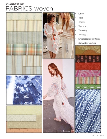 CLANDESTINE FABRICS woven • Linen • Voile • Gauze • Texture • Tapestry • Viscose • Embroidered cottons • Saltwater washes Donegar Donegar S S 2018 . 41