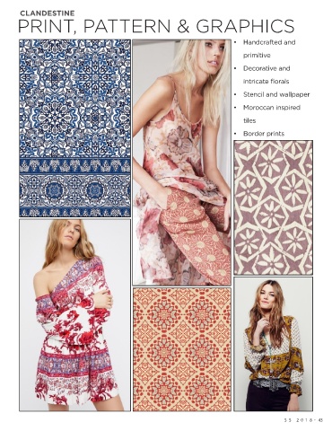 CLANDESTINE PRINT, PATTERN & GRAPHICS • Handcrafted and primitive • Decorative and intricate florals • Stencil and wallpaper • Moroccan inspired tiles • Border prints S S 2018 . 43