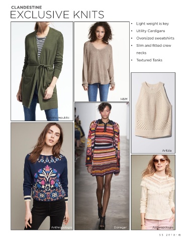 CLANDESTINE EXCLUSIVE KNITS • Light weight is key • Utility Cardigans • Oversized sweatshirts • Slim and fitted crew necks • Textured Tanks H&M Banana republic Aritzia Anthropologie Donegar Anthropologie S S 2018 . 45