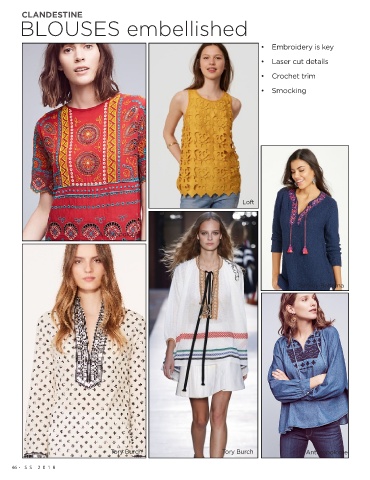 CLANDESTINE BLOUSES embellished • Embroidery is key • Laser cut details • Crochet trim • Smocking Loft Anthropologie Tommy Bahama Tory Burch Tory Burch Anthropologie . 46 S S 2018
