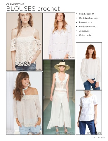 CLANDESTINE BLOUSES crochet • Slim & loose fit • Cold shoulder tops • Peasant tops • Bardot/Bandeau • Jumpsuits • Cotton voile Tory Burch Anthropologie Club Monaco American Eagle For Love & Lemons Banana Republic S S 2018 . 47