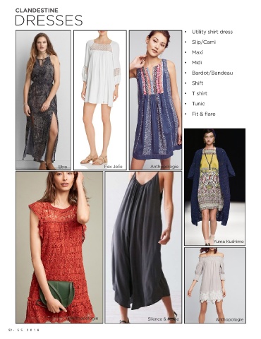 CLANDESTINE DRESSES • Utility shirt dress • Slip/Cami • Maxi • Midi • Bardot/Bandeau • Shift • T shirt • Tunic • Fit & flare Etro Fox Jolie Anthopologie Yuma Kushimo Anthopologie Silence & Noise Anthopologie . 52 S S 2018