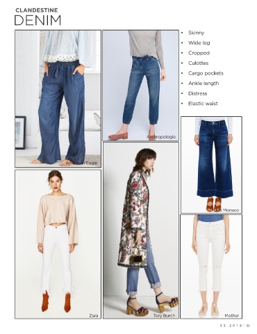 CLANDESTINE DENIM • Skinny • Wide leg • Cropped • Culottes • Cargo pockets • Ankle length • Distress • Elastic waist Anthropologie American Eagle Club Monaco Splendid Zara Tory Burch Mother S S 2018 . 55