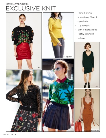 PSYCHOTROPICAL EXCLUSIVE KNIT • Floral & animal embroidery Mesh & open knits • Lightweight • Slim & oversized fit • Highly saturated colours Banana Republic Zara Zara Anthropologie Victoria Beckham . 72 S S 2018