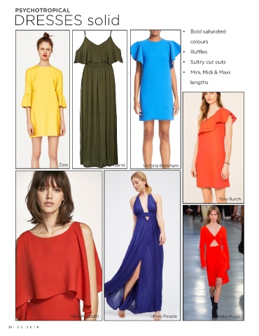 PSYCHOTROPICAL DRESSES solid • Bold saturated colours • Ruffles • Sultry cut outs • Mini, Midi & Maxi lengths Zara River Island Victoria Beckham Tory Burch Massimo Dutti Free People Emilio Pucci . 76 S S 2018