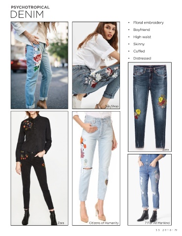 PSYCHOTROPICAL DENIM • Floral embroidery • Boyfriend • High waist • Skinny • Cuffed • Distressed Top Shop Topshop Zara Zara Citizens of Humanity 7 For All Mankind S S 2018 . 79