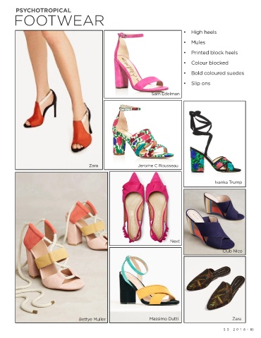PSYCHOTROPICAL FOOTWEAR • High heels • Mules • Printed block heels • Colour blocked • Bold coloured suedes • Slip ons Sam Edelman Zara Jerome C Rousseau Ivanka Trump Santorini Next Club Nico Bettye Muller Massimo Dutti Club MonacoZara S S 2018 . 85