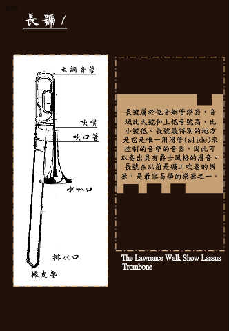 長號 / 主調音管 長號屬於低音銅管樂器,音 吹嘴 域比大號和上低音號高,比 小號低。長號最特別的地方 吹口管 是它是唯一用滑管(slide)來 控制的音準的音器,因此可 以奏出具有爵士風格的滑音。 長號在以前是礦工吹奏的樂 器,是最容易學的樂器之一。 喇叭口 排水口 The Lawrence Welk Show Lassus Trombone 橡皮墊