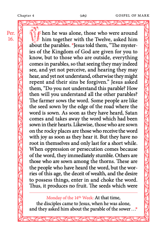 him together with the Twelve, asked him about the parables. *Jesus told them, “The myster- ies of the Kingdom of God are given for you to know, but to those who are outside, everything comes in parables, so that seeing they may indeed see, and yet not perceive, and hearing they may hear, and yet not understand, otherwise they might repent and their sins be forgiven.” Jesus asked them, “Do you not understand this parable? How then will you understand all the other parables? The farmer sows the word. Some people are like the seed sown by the edge of the road where the word is sown. As soon as they have heard, Satan comes and takes away the word which had been sown in their hearts. Likewise, those who are sown on the rocky places are those who receive the word with joy as soon as they hear it. But they have no root in themselves and only last for a short while. When oppression or persecution comes because of the word, they immediately stumble. Others are those who are sown among the thorns. These are the people who have heard the word, but the wor- ries of this age, the deceit of wealth, and the desire to possess things, enter in and choke the word. Thus, it produces no fruit. The seeds which were