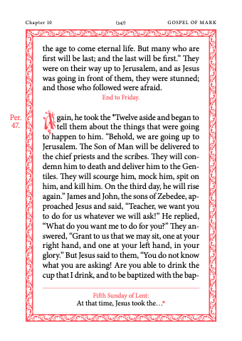 tell them about the things that were going to happen to him. “Behold, we are going up to Jerusalem. The Son of Man will be delivered to the chief priests and the scribes. They will con- demn him to death and deliver him to the Gen- tiles. They will scourge him, mock him, spit on him, and kill him. On the third day, he will rise again.” James and John, the sons of Zebedee, ap- proached Jesus and said, “Teacher, we want you to do for us whatever we will ask!” He replied, “What do you want me to do for you?” They an- swered, “Grant to us that we may sit, one at your right hand, and one at your left hand, in your glory.” But Jesus said to them, “You do not know what you are asking! Are you able to drink the cup that I drink, and to be baptized with the bap-