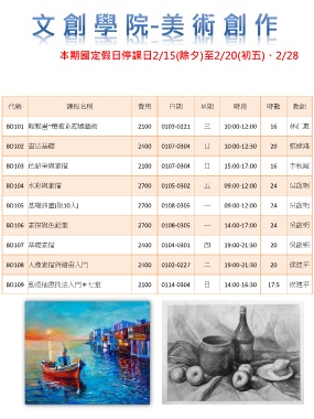 BD105 基礎油畫(限10人) 2700 0108-0305 一 09:00-12:00 24 吳啟明
