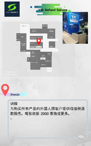 Vat Refund Service ตําแหน่ง 讲解 为购买所有产品的外国⼈顾客⼾提供增值税退 款服务。每张收据 2000 泰铢或更多。 -
