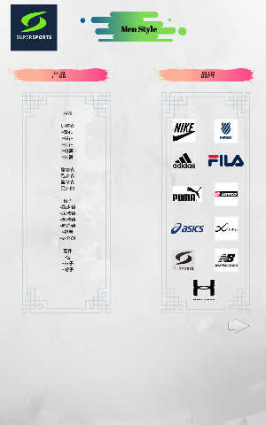 Men Style 产品 品牌 服⾐ 训练⾐ -背⼼ -短袖 -⻓袖 -短裤 -⻓裤 瑜伽⾐ 跑步⾐ 篮球⾐ 另外的 鞋⼦ -跑步鞋 -⾜球鞋 -篮球鞋 -时尚鞋 -拖鞋 -另外的 配件 -包 -袜⼦ -帽⼦