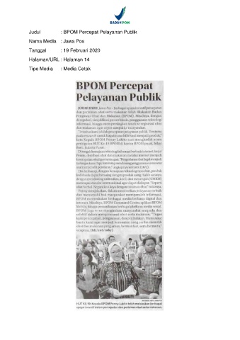 Judul : BPOM Percepat Pelayanan Publik Nama Media : Jawa Pos Tanggal : 19 Februari 2020 Halaman/URL : Halaman 14 Tipe Media : Media Cetak