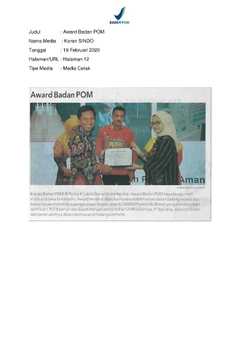Judul : Award Badan POM Nama Media : Koran SINDO Tanggal : 19 Februari 2020 Halaman/URL : Halaman 12 Tipe Media : Media Cetak
