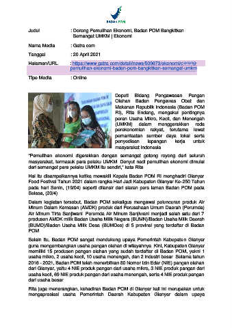 Judul : Dorong Pemulihan Ekonomi, Badan POM Bangkltkan