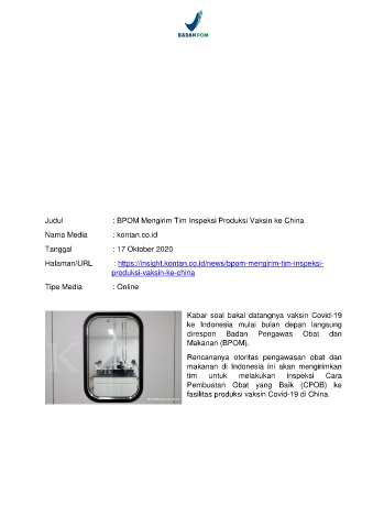 Judul : BPOM Mengirim Tim Inspeksi Produksi Vaksin ke China