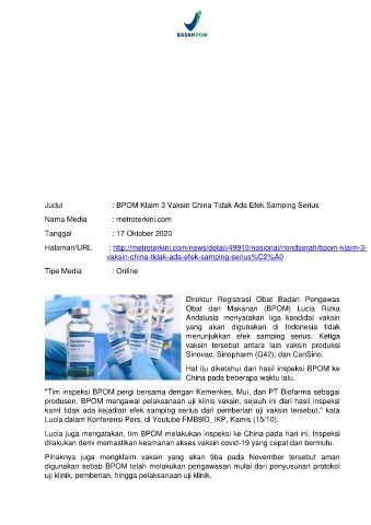 Judul : BPOM Klaim 3 Vaksin China Tidak Ada Efek Samping Serius