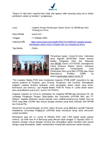 Judul : Inspeksi Proses Pembuatan Vaksin Covid-19, BPOM dan MUI