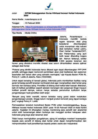 Judul : BPOM Selenggarakan Bursa Hilirisasi Inovasi Herbal Indonesia