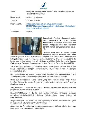 Judul : Pengawalan Penyaluran Vaksin Covid-19 Diperkuat, BPOM