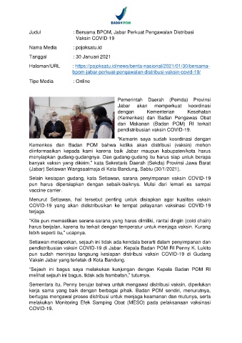 Judul : Bersama BPOM, Jabar Perkuat Pengawalan Distribusi
