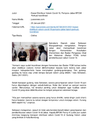 Judul : Kawal Distribusi Vaksin Covid-19, Pemprov Jabar-BPOM